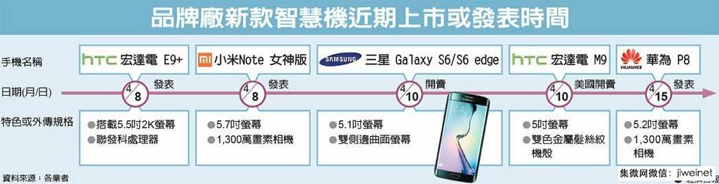 本周起宏達電HTC One M9、E9+,以及三星新機Galaxy S6/S6 edge上市,加上8日小米歡慶米粉節,以及15日華為發表新機P8,大立光、聯發科等相關供應鏈忙出貨,擺脫傳統淡季的“五窮”魔咒。