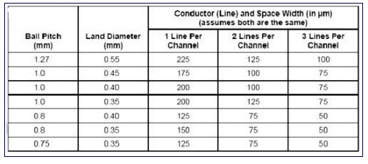 一旦完成了Dog bone型扇出,并且確定了特定的過孔焊盤尺寸,二步就是定義從BGA進(jìn)入電路板內(nèi)層的走線寬度。確認(rèn)走線寬度時(shí)要考慮許多因素。表1顯示了走線寬度。走線之間要求的小空間限定了BGA迂回布線空間。重要的是要知道,減小走線之間的空間將增加電路板制造成本。