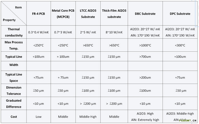 目前市場上廣泛使用的電路板類型如下表一所示,其中陶瓷基板其高導熱系數、高線路解析度、低累進公差、及允許打線工藝與直接共晶工藝等特性皆優于FR-4 PCB與MCPCB。但是,陶瓷基板并非皆具有相同的特性,因工藝與材料的差異,陶瓷基板因而可分類為:低溫共燒陶瓷(LTCC, Low-Temperature Co-fire Ceramics)基板、厚膜(Thick-Film)陶瓷基板、DBC (Direct Bonding Copper)陶瓷基板與DPC (Direct Plating Copper)陶瓷基板,其中DPC陶瓷基板又可稱為薄膜(Thin-Film)陶瓷基板。