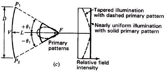 上圖顯示了在設計拋物面天線時,所需面對的取舍問題:弧面對應的夾角和饋線的指向性。如果給定一個直徑與焦距長度,對弧面直徑D所對應的夾角而言,此饋線場型太寬了,將造成能量大量溢出,導致增益減少且天線溫度增高。反之,如果所對應的夾角大于饋線的「半功率波束寬度(Half Power Beam Width;HPBW)」,將會導致照射度不一致,且在邊緣部位會逐漸減弱,并伴隨著輻射效益與增益的損失。