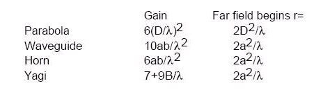 下面列出了各式天線的近似指向性(增益)和遠場邊界以供參考: