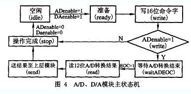 系統設計中,將AD、DA操作封裝成一單獨模塊,由上層控制模塊輸出命令字及控制信號啟動本模塊的相應操作,操作完成后(進入idle狀態) ,本模塊發出相應狀態信號至上層模塊。