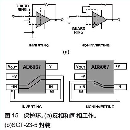保護環,或者說“隔離環”,是運算放大器常用的另一種屏蔽方法,它用于防止寄生電流進入敏感結點。其基本原理很簡單——用一條保護導線將敏感結點完全包圍起來,導線保持或者迫使它保持(低阻抗)與敏感結點相同的電勢,因此使吸收的寄生電流遠離了敏感結點。圖15(a)示出了用于運算放大器反相配置和同相配置中的保護環的原理圖。圖15(b)示出用于SOT-23-5封裝中兩種保護環的典型布線方法。