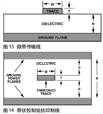 微帶控制阻抗印制線,如圖13所示,可以用在PCB的任意一面;它直接采用其下面的接地平面作為其參考平面。
