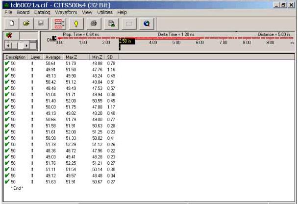 以下是采用TDR測(cè)試系統(tǒng)測(cè)試該板的阻抗測(cè)試結(jié)果,從結(jié)果可看出該板所測(cè)試的阻抗都在47.5∽52.5Ω之間,即完全滿足客戶50±5%Ω(50±2.5Ω)的阻抗要求. 因此,可看出對(duì)于客戶±8%甚至±5%的阻抗控制精度要求只要在生產(chǎn)前采用計(jì)算精度比較高的軟件進(jìn)行較為準(zhǔn)確的模擬預(yù)測(cè),結(jié)合模擬預(yù)測(cè)的結(jié)果對(duì)相應(yīng)的一些參數(shù)做適當(dāng)調(diào)整,在生產(chǎn)過(guò)程中對(duì)重點(diǎn)工序加以特別的控制,同時(shí),測(cè)量時(shí)確保測(cè)量的正確性,還是可以達(dá)到的。