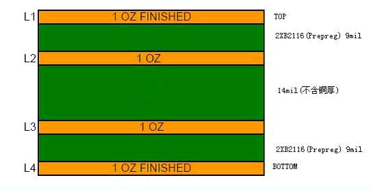 以下是我司生產(chǎn)的一種板件,該板的要求:4層板,完成板厚1.0±0.10mm,板材采用FR4,客戶有指定的疊層結(jié)構(gòu),見(jiàn)下圖