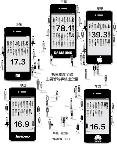 IDC數據顯示,排名前兩名的三星和蘋果,分別以7810萬部和3930萬部的出貨量占據23.8%和12.0%的市場份額。在聯想收購摩托羅拉之前,根據IDC的數據,三小米、四聯想和五名LG的份額只差0.2個百分點。