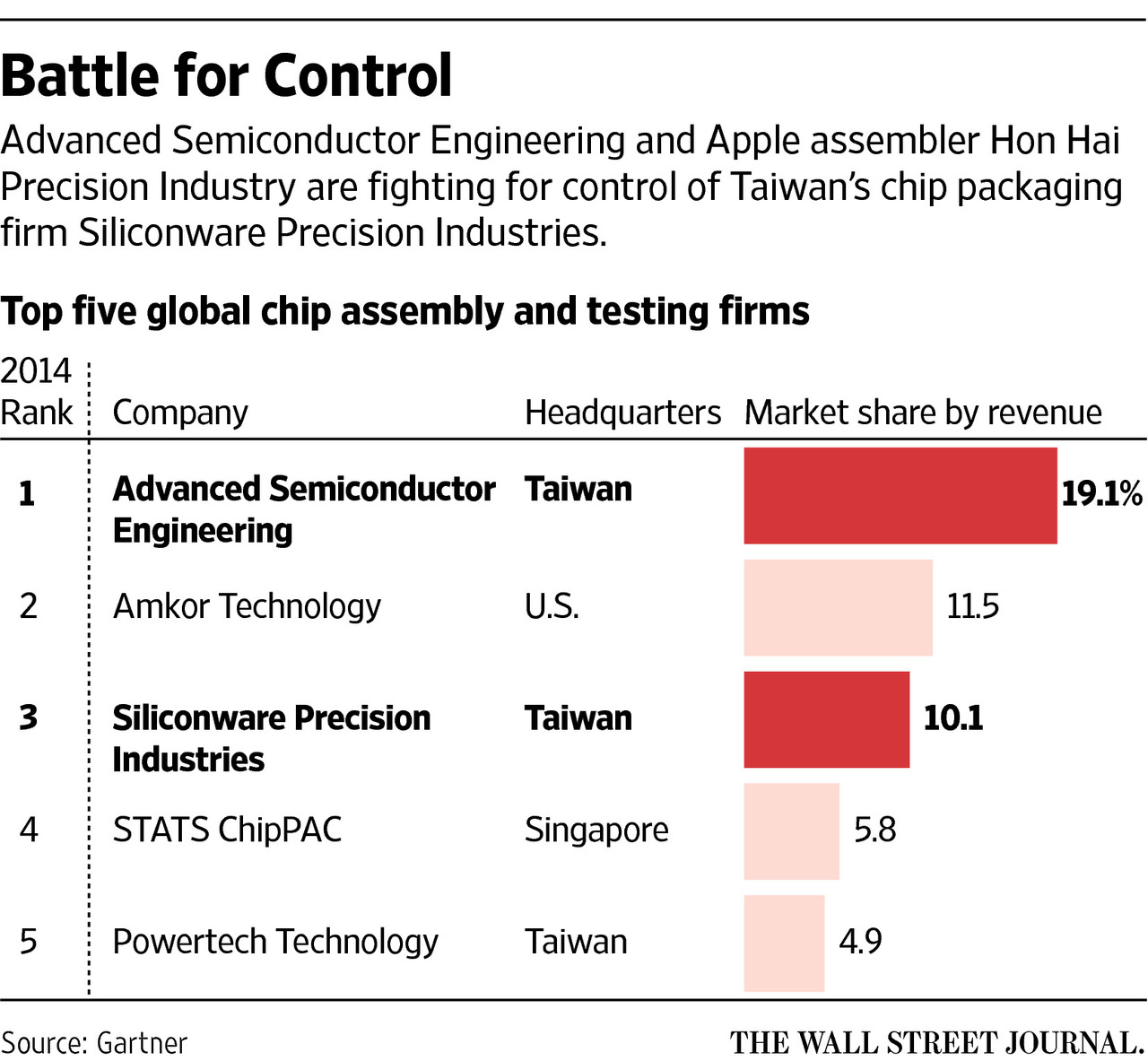 全球五大芯片封裝與測試公司,排在一和三位的分別是日月光和鴻海精密
