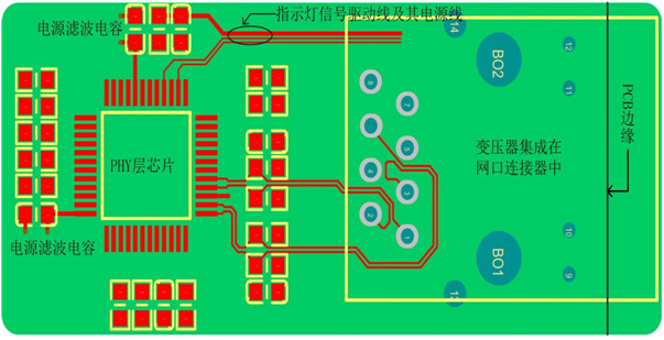1. 圖 2網(wǎng)口變壓器沒有集成在網(wǎng)口連接器里的參考電路PCB布局、布線圖,下面就以圖 2介紹以太網(wǎng)電路的布局、布線需注意的要點(diǎn)。