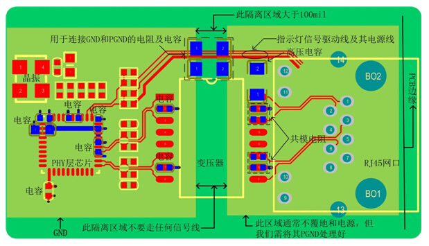 e) 變壓器的兩邊需要割地:即RJ45連接座和變壓器的次級線圈用單獨(dú)的隔離地,隔離區(qū)域100mil以上,且在這個隔離區(qū)域下沒有電源和地層存在。這樣做分割處理,就是為了達(dá)到初、次級的隔離,控制源端的干擾通過參考平面耦合到次級;